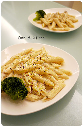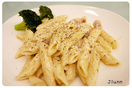 接著就倒入白醬煮熱即可,若是覺得太乾可加點煮麵水...