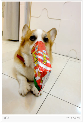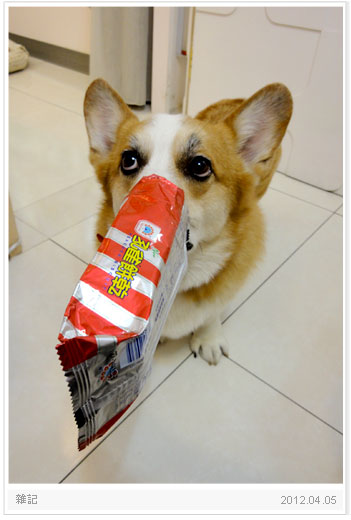 小屁孩沒得吃,給牠聞聞袋子舔舔餅乾屑也好,結果一聞變這樣.....