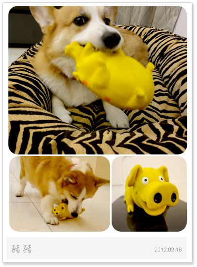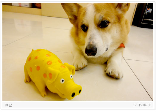 第一次玩小豬豬,對於豬豬的叫聲露出很疑惑但不甘示弱的表情~