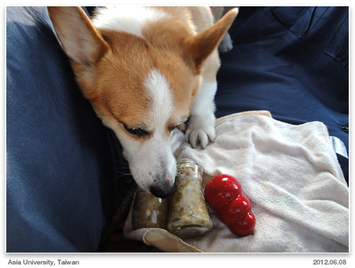 噗!為什麼會有玻璃瓶?因為前一晚臨時派老爺去買kong,結果賣完惹撲了個空!